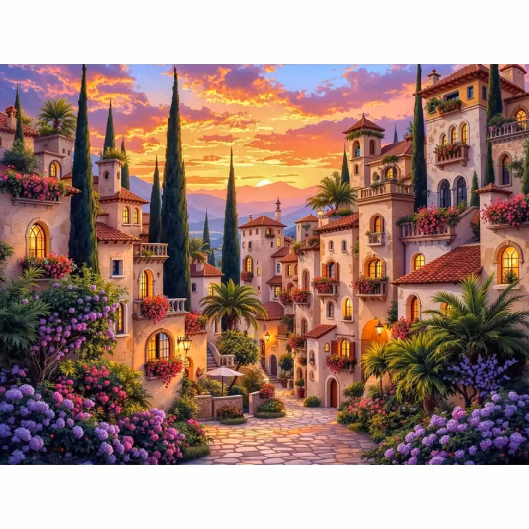 Diamanttavla Stad I Solnedgång